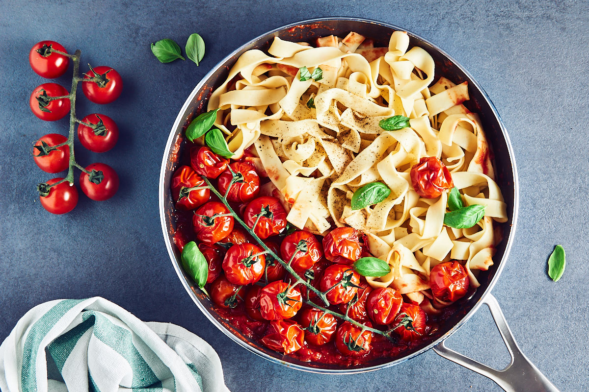 Makaron gotujemy al dente w osolonej wodzie. Świeże pomidory sparzamy, obieramy ze skórki, kroimy na ćwiartki. Na oleju podsmażamy czosnek i papryczkę peperoncino. Wrzucamy pomidory, doprawiamy solą i pieprzem, mieszamy i gotujemy przez około 3 minuty. Dodajemy makaron, mieszamy, posypujemy parmezanem i posiekaną bazylią. Wstawiamy na około 5-7 minut do rozgrzanego piekarnika.