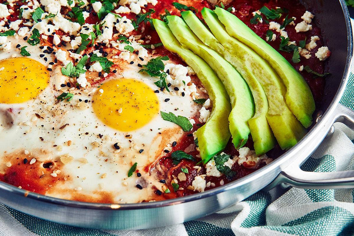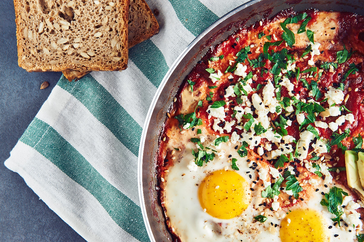 Cebulę kroimy i podsmażamy na oleju, aż będzie szklista. Dodajemy wyciśnięte ząbki czosnku i chili w płatkach. Dorzucamy sparzone wcześniej i obrane ze skórki pomidory. Dodajemy paprykę pokrojoną w niedużą kostkę. Sos mieszamy i przyprawiamy solą, pieprzem, kuminem i czarnuszką. Gotujemy przez ok. 7 minut a następnie wbijamy jajka. Przykrywamy i gotujemy przez ok. 10-15 minut, aż białka jajek się zetną. Gotową szakszukę posypujemy posiekaną natką i kolendrą. Podajemy z pieczywem i awokado. Smacznego!