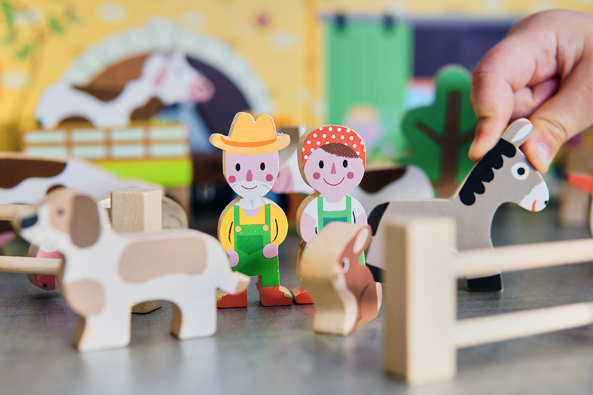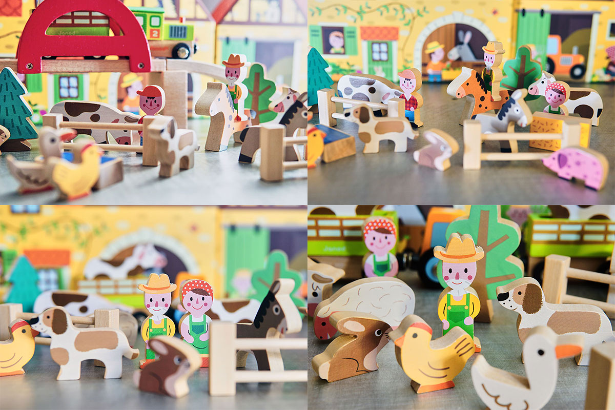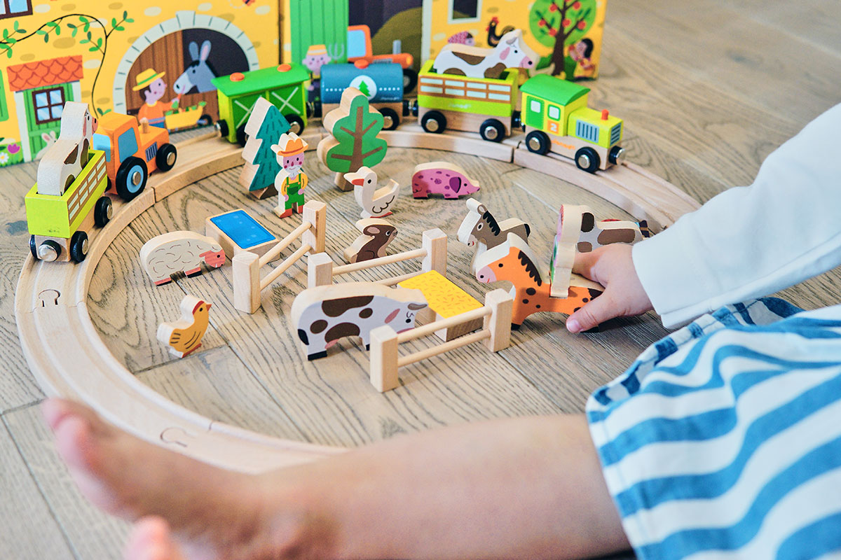 Zestaw składa się aż z 54 drewnianych elementów: torów, mostku, pociągu z lokomotywą i 3 wagonami oraz innych kolorowych figurek o różnych kształtach i wielkościach, takich jak zwierzęta wiejskie, rolnicy czy traktor z przyczepą, które zachęcają maluchy do długiej zabawy. Dodatkowo, w komplecie znajduje się pudełko w kształcie domku wiejskiego, które stanowi dodatkowy element scenerii.