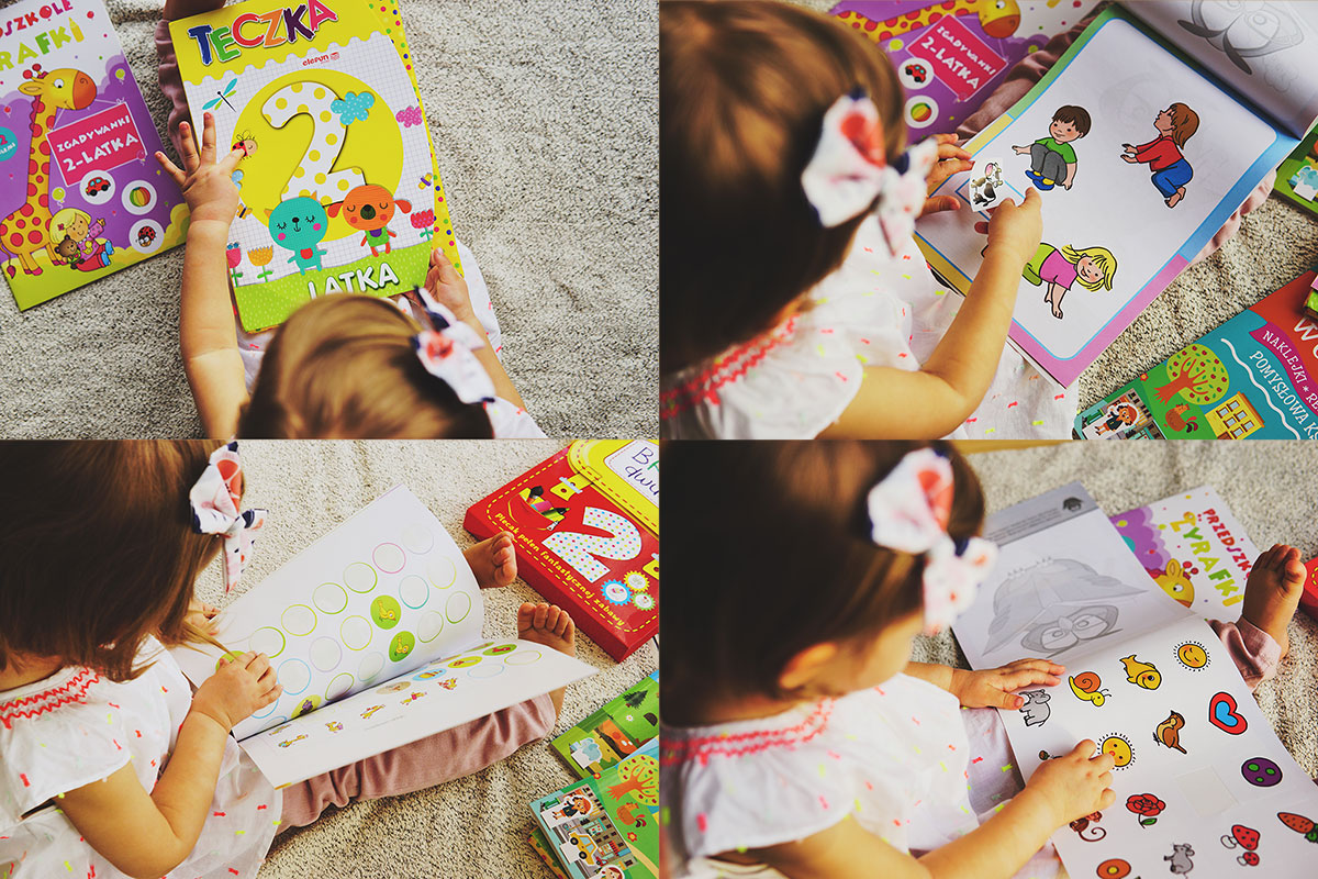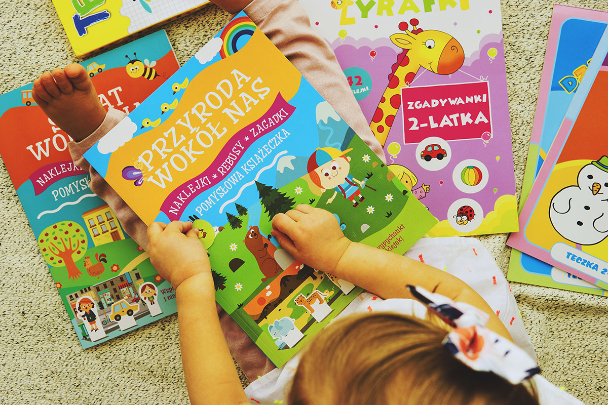 Książki zawierają naklejki, zagadki i łamigłówki, dzięki którym poprzez zabawę maluchy poznają otaczający świat. Znajdziemy tu też wycinanki, karuzelę do powieszenia oraz pudełko do samodzielnego złożenia.