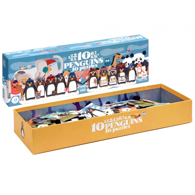 Puzzle Londji 10 Pingwinów to propozycja dla malucha, który fascynuje się liczeniem. Zestaw zawiera 55 elementów – można z nich ułożyć 10 obrazków przedstawiających różne zwierzęta. Na każdym z nich jest inna liczba: 1 sowa, 2 krokodyle, 3 świnki … aż wreszcie 10 pingwinów.