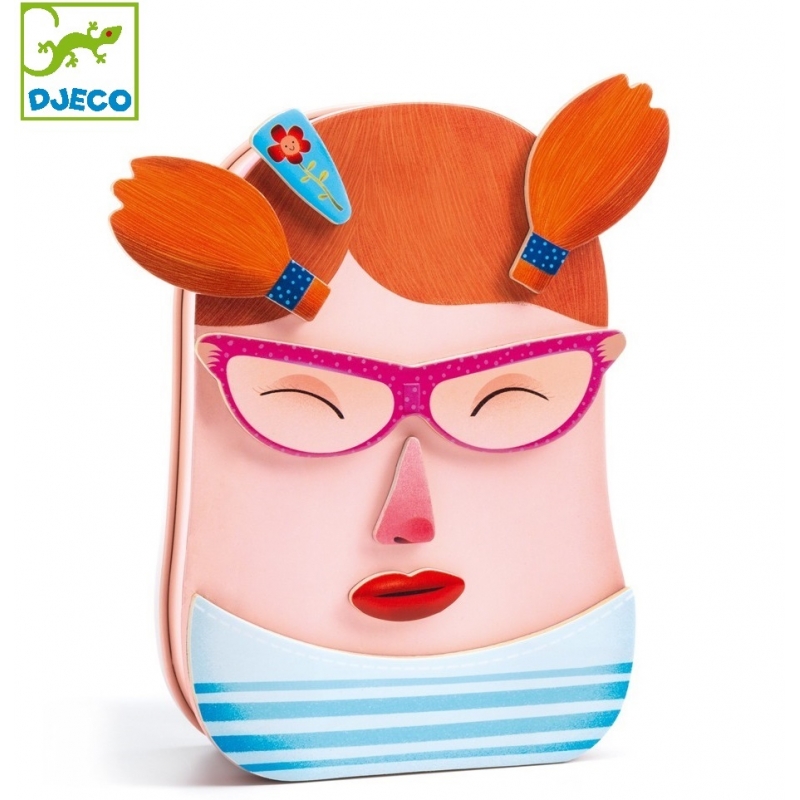 Układanka magnetyczna Portrerty Djeco to duże, estetyczne, metalowe pudełko. W środku znajduje się 37 magnesów z elementami twarzy tj. oczy, nosy, usta i ozdobami np. czapki, spinki, okulary. Zabawa polega na układaniu na planszy magnesów i ich dopasowywaniu – chłopiec czy dziewczynka, kucyki czy wąsy, okulary czy fajka?