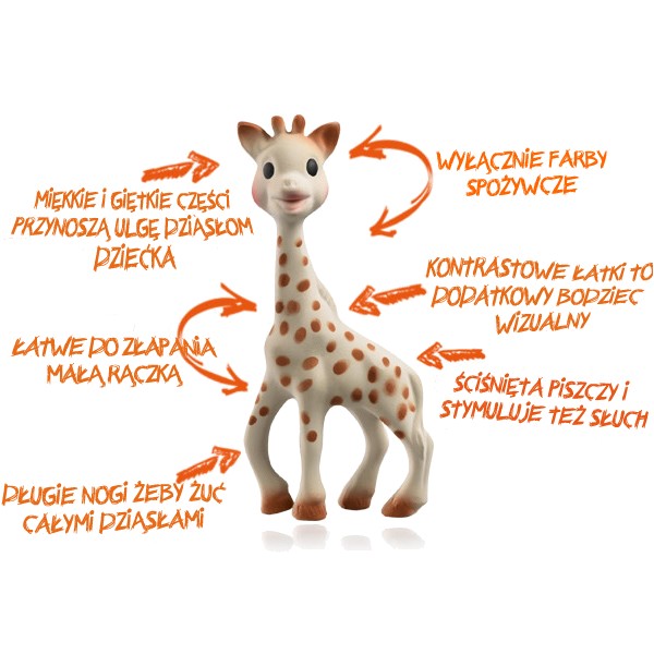 Żyrafa stymuluje wzrok (kontrastowe łatki), słuch (ściśnięta piszczy), dotyk a nawet smak dziecka.